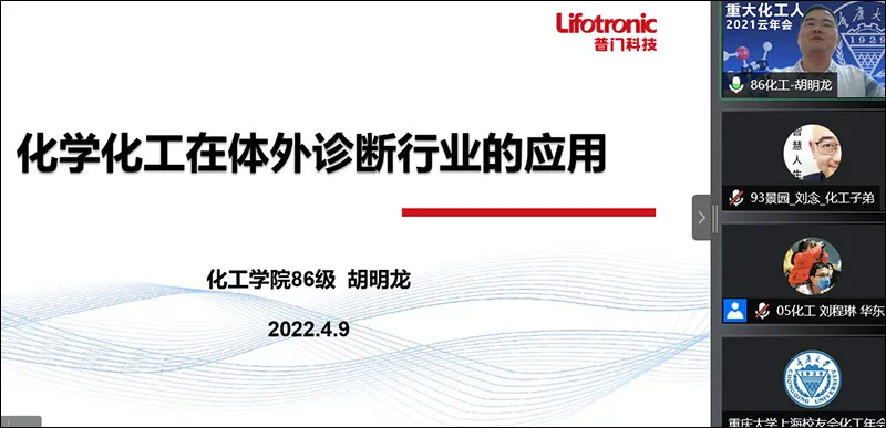 分享了化工过程强化及资源循环利用研究成果及应用;普门科技董事及总经理、86级化工胡明龙分享了化学化工在体外诊断中的应用,重点介绍了普门科技在医疗器械领域的技术优势,及其对研发的重视和广泛的客户基础。两位特邀报告人的报告内容干货满满,引起了校友们强烈兴趣和热烈讨论。随后,86级化工陈林校友组织大家讨论了在中美关系新形势下,智能电子(手机)行业中“化工人的新机遇”,83级应化高云芳校友和07级化工赵春燕校友,分别结合自己在锂电和手机领域的工作经验,分享了该行业遇到的“卡脖子”技术难题,并鼓励相关行业的化工校友积极合作、共同攻关。