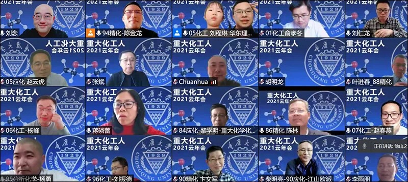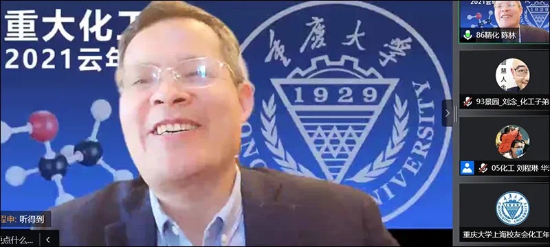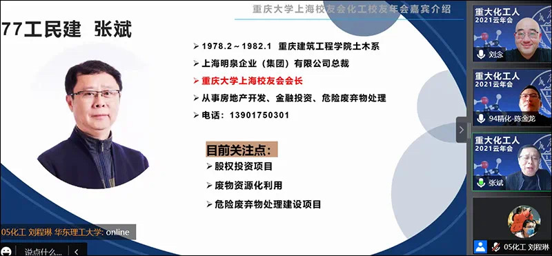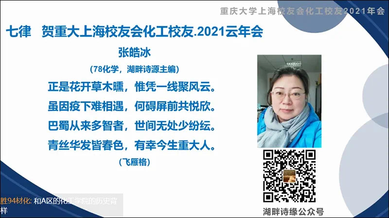 会上,05级化工刘程琳校友介绍了参会的在沪校友,82级应化游波作为在沪化工校友代表致辞,他朗诵了由78级化学张皓冰校友(重大校友主办的“湖畔诗源”主编)为此次年会创作的贺诗,体现了校友们对此次线上相聚的期待与喜悦。