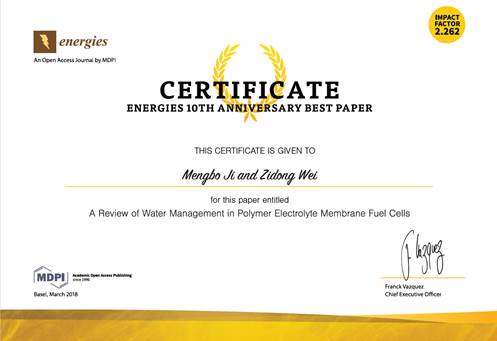 瑞士Energies杂志最近为了庆祝创刊十周年,评选出 “十周年最佳论文奖”(10th Anniversary Best Paper Award 2018)。魏子栋教授和博士研究生季孟波于2009年发表的“A Review of Water Management in Polymer Electrolyte Membrane Fuel Cells” (Mengbo Ji, Zidong Wei*, Energies 2009, 2, 1057-1106) 一文,获得此项殊荣。文章自发表以来,他引达到108次,被认为是燃料电池水管理领域最有价值的文章之一。