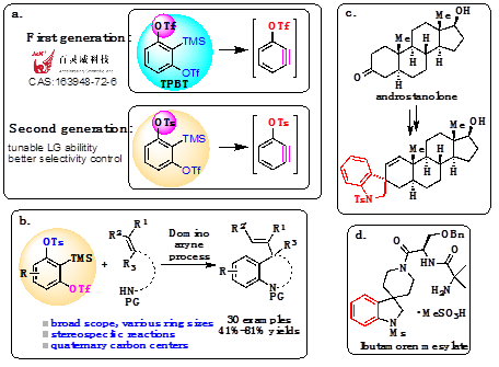 图2. a. 两代多米诺芳炔前体;b. 新型苯并氮杂环的高效制备;c. 雄激素类药androstanolone的结构改造; d. 治疗侏儒症药物Ibutamoren mesylate