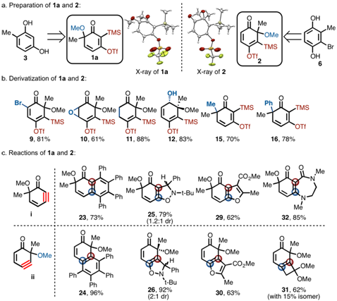 基于上述设想,李杨课题组通过去氧化芳构化方法合成出两类环己炔前体1a及2(图3a)。化合物1a及2不但在其六元环上含有羰基,甲氧基以及烯烃等取代基,这些基团还可转化为多种其它官能团,且所有转化中TMS及OTf基团未受影响,大大扩展了这一去芳构化手段能够获得的多取代环己炔前体的范围(图3b)。进一步研究发现,1a与2经过活化可高效地生成相应的环己炔中间体i及ii;当i及ii与不同试剂反应时,展示了良好的反应性及选择性,例如,[4+2]、[3+2]、[2+2]环加成反应,亲核反应及C-N键插入等反应(图3c)。这些反应实例显示,这两类环己炔活性中间体可快速构建不同种类的多取代环己烃类化合物,具有广阔的潜在应用价值。