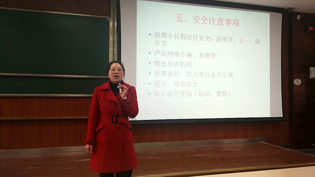 大会尾声,伍老师提醒同学们注意身边的安全隐患。当今大学生极易遭受不法分子的伤害,近期不少大学生受骗甚至人身安全遭到侵犯的案例也为我们敲响了警钟。伍老师强调,当下大学生已成为心理亚健康高发人群,在注意人身财产安全的同时,我们更应关注自身心理健康,有问题及时向相关诊疗部门就诊咨询。在大会即将结束之际,伍老师对全体同学寄予希望,愿在新的学期里,大家能努力学习,团结友爱,选择正确的人生道路,奋力前行。