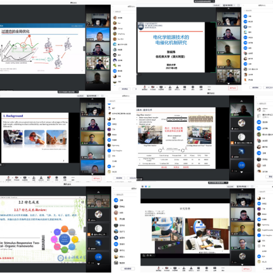 下午半场中温佳琳博士作题为《实用均相氢化》的报告,李思伟博士作题为《高分散多相催化剂配位环境调控》,李超博士作题为《几种有机材料在电化学储能器件中的应用研究》,沈阳博士作题为《基于反向双光束光声光谱的半导体金属氧化物光催化剂的精密表征》的报告,邹路遥博士作题为《应用(亚)毫米波光谱学研究不稳定分子Studying unstable molecules using (sub)millimeter-wave spectroscopy》的报告,李怀光博士作题为《基于导电高分子构建应用于氧气敏感性催化剂的保护系统》的报告,张敏博士作题为《Artificial transmenbrane channels construction,and mechanochemistry of mechanical bonds》的报告。