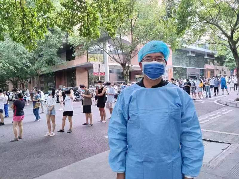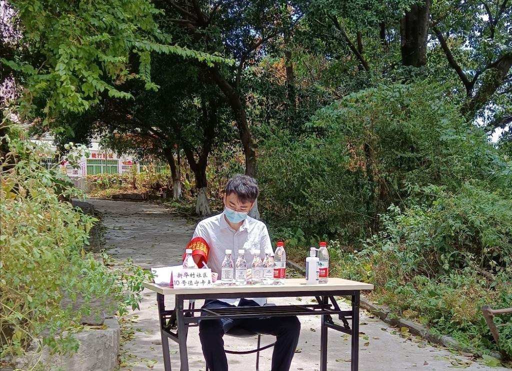 上学期末刚刚引进的青年教师张骞老师在收到志愿者招募的信息后加入了志愿者队伍,冒着40几度的高温,顶着烈日,负责对新华村社区的值守,出入登记管理,物资发放,出入政策解释,服务居民之类的工作。半天下来,皮肤已经晒得发红,衣服也已经湿透。