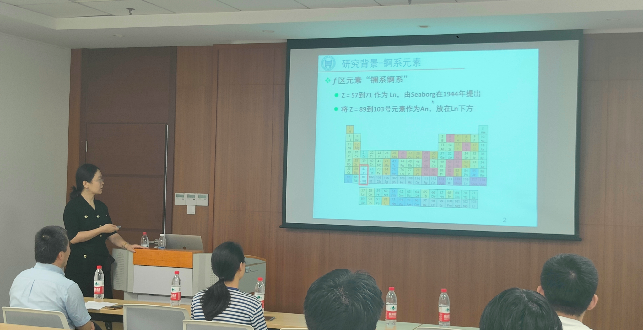 在报告中,胡老师详细阐述了4f电子与5f电子参与成键对锕系氧化物结构的影响,深入浅出地为在场师生讲解如何精准计算具有复杂电子结构的锕系氧化物,并提出了f轨道贡献越大,三原子结构越趋于直线型的重要结论,这对精准调控锕系化合物结构具有重要意义。