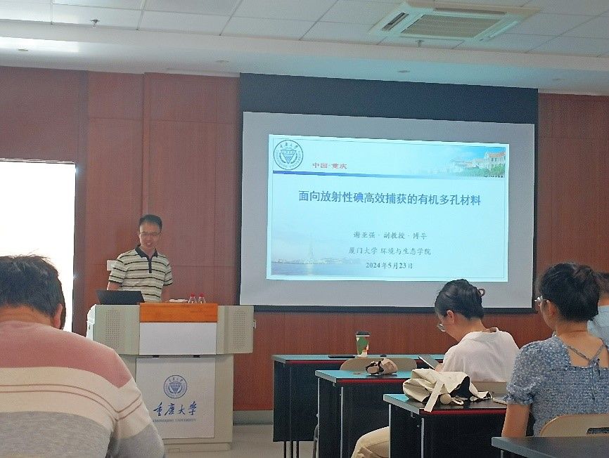 讲座主题围绕“开发新型吸附剂以实现高效的碘捕获”展开。谢亚强副教授从“离子型COFs(iCOFs)材料”、“双位点COFs材料”和“联咪唑等多孔有机聚合物”三种吸附剂设计合成及其在高温条件下高效捕获放射性碘的性能,向全体师生做了详细的阐述。相关研究结果对高效的碘捕获起到推动作用。