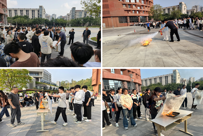 实验室安全事故应急演练之消防灭火实训演练在理科楼广场进行。首先保卫处工作人员详细讲解了灭火器的正确使用方法,并现场演示灭火操作。随后,同学们在保卫处工作人员的指导下依次体验使用干粉灭火器、二氧化碳灭火器和灭火毯扑灭真实火源。通过灭火实操,同学们不仅掌握了正确的灭火方法,还体验了遭遇火灾时的紧急情况,很好地锻炼了同学们的风险应对能力。