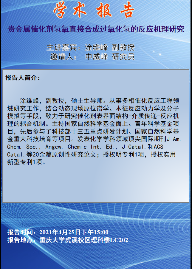 贵金属催化剂氢氧直接合成过氧化氢的反应机理研究 涂维峰副教授