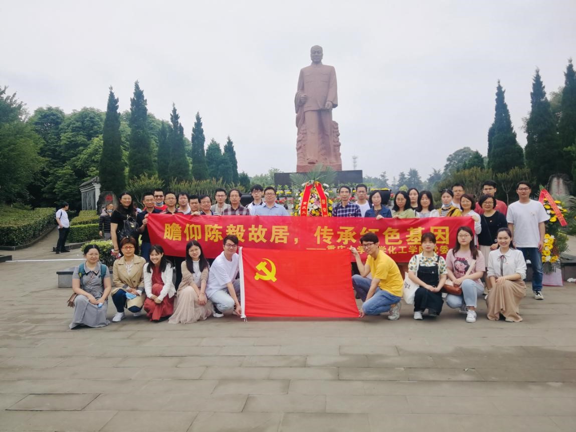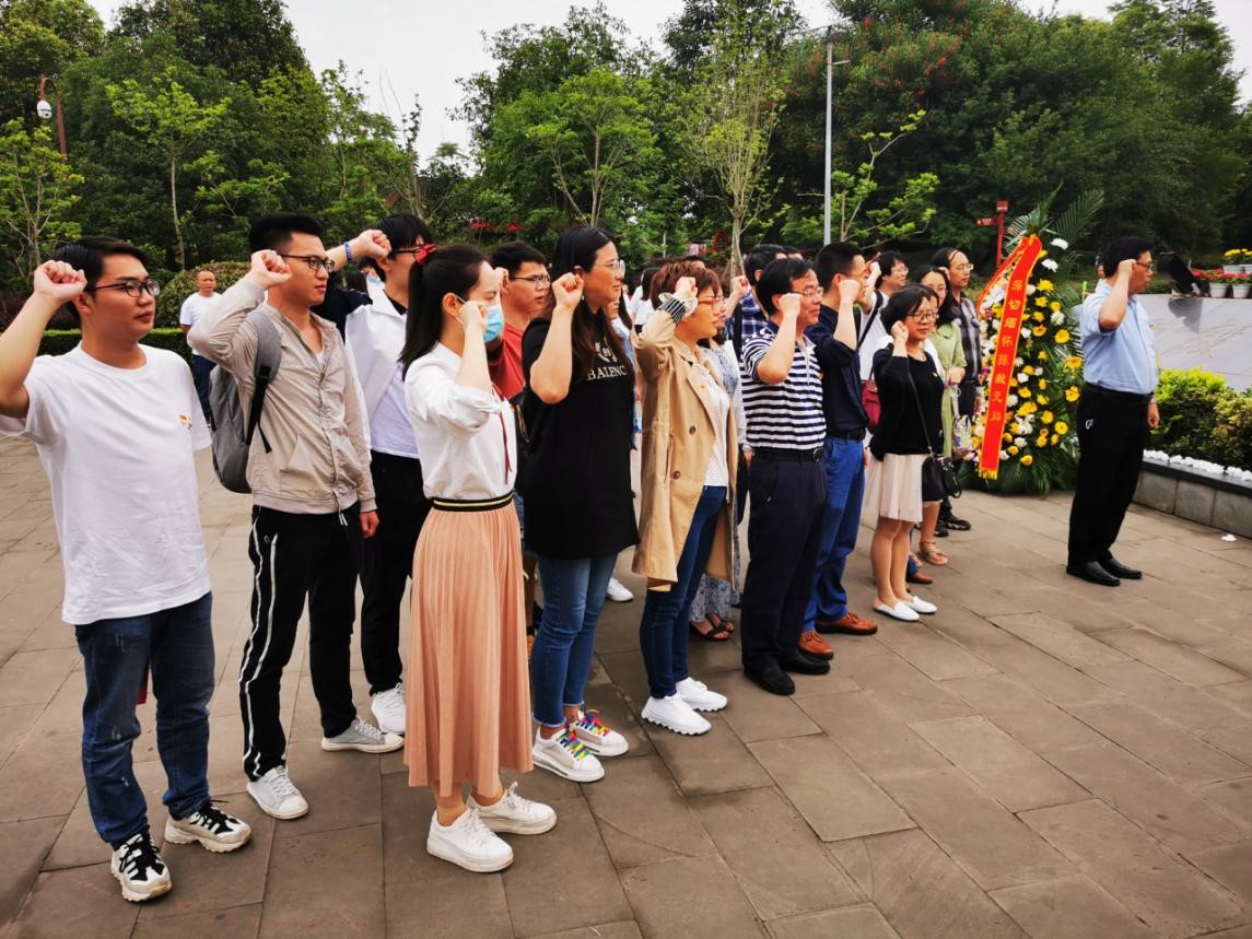 党委书记刘仁龙缓步上前,仔细整理花篮缎带,全体党员向陈毅元帅敬献花篮并三鞠躬。党旗鲜红、誓言铮铮。在刘仁龙同志的带领下,全体党员面对党旗,高举右手,重温入党誓词。每个党员都用激昂的宣誓声来抒发对党忠诚的决心,表达了对无产阶级革命家、军事家、外交家陈毅元帅的敬仰与深切缅怀。