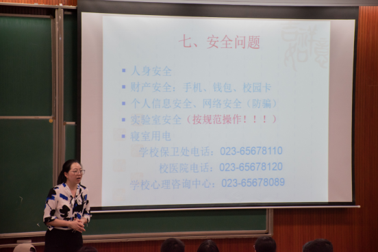 由于国庆中秋假期的临近,伍丽对放假安排及安全问题做了详细讲解。其中,安全问题最为重要和严肃,安全不仅关乎每个人的学习与生活,并且也关乎到每个家庭的幸福。她将安全问题分为五个板块:人身安全、财产安全、网络安全、实验室安全以及寝室安全,深入细致地为新生们做好安全知识讲解。