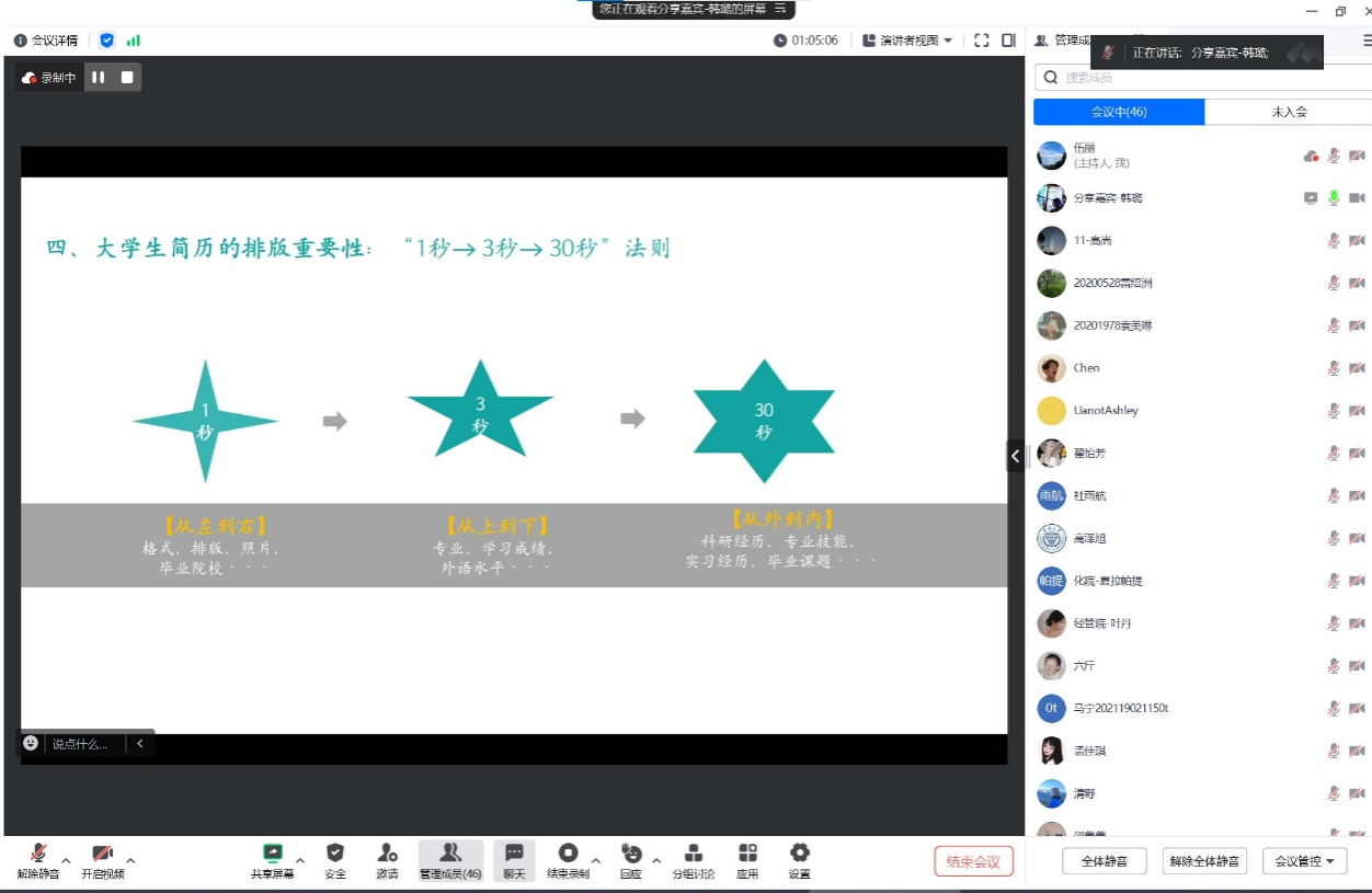 韩璐从简历的本质、简历的用途、简历的构成要素、简历的排版重要性及简历制作常见误区五个方面栩栩道来,从细节出发、从实际情况出发,为同学们制作个人求职简历进行了极为有用的指导。此外,韩老师还列出了多份简历并进行点评,带领同学们利用“1-3-30秒”法则点评简历,指出优点,分析问题,并告诫同学们要避免出现类似错误。