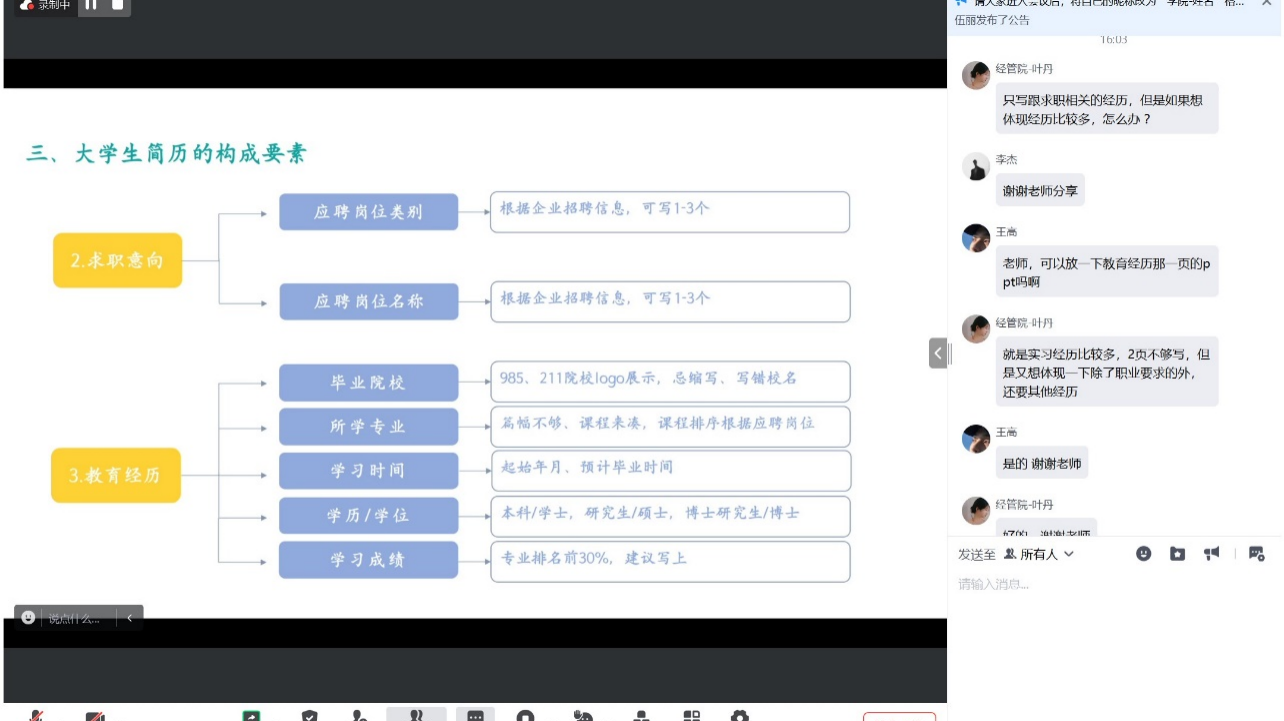 讲座开始前,伍丽介绍了简历在求职过程中的重要意义,建议同学们对自个人的简历进行优化,提升求职核心竞争力,并介绍了主讲韩璐的基本情况。