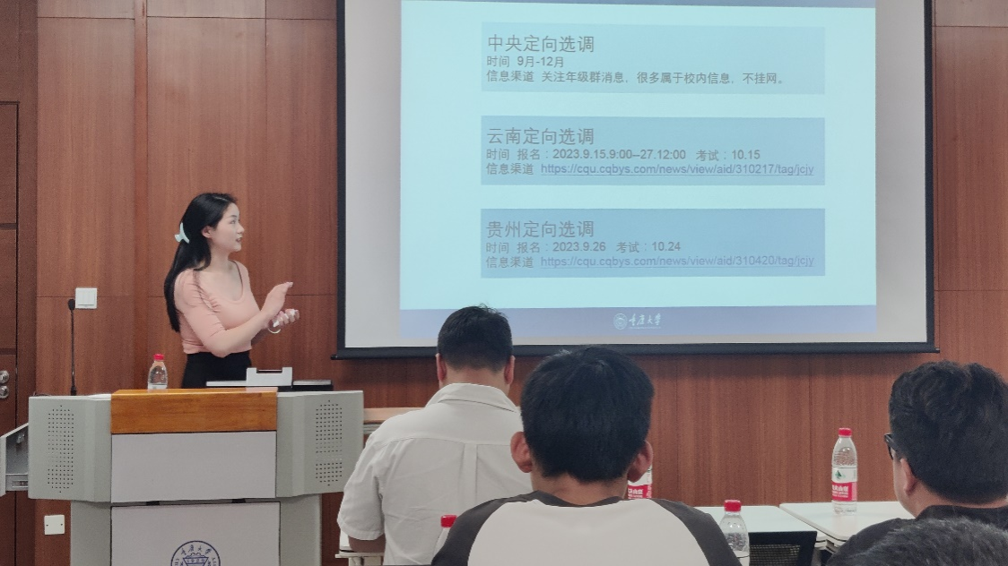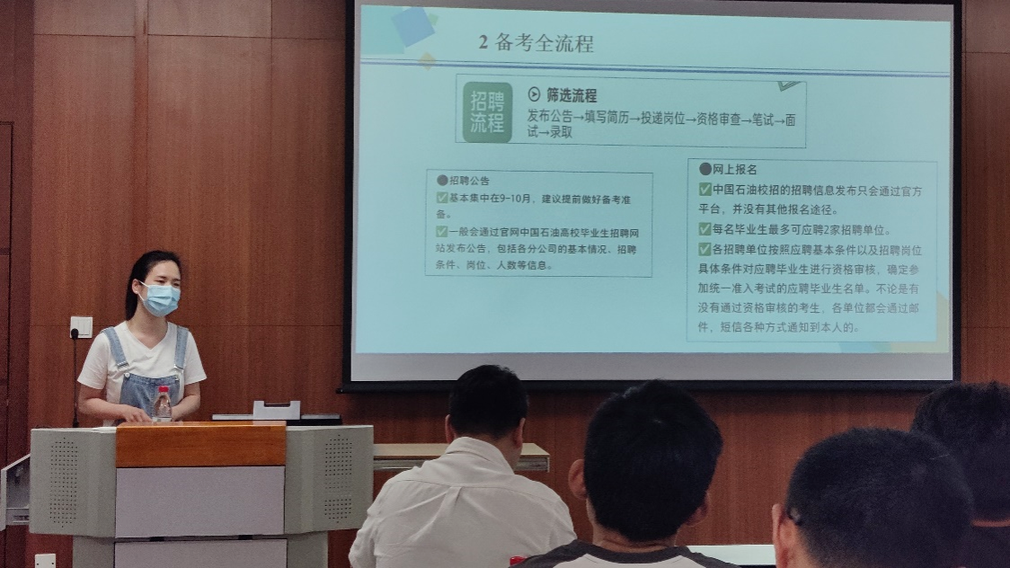 随后,三位优秀的师兄师姐——邓秋月、姚远和杨雅雯,分别分享了他们的求职经历和心得。第一位分享者是邓秋月,目前受聘于中国石油化工集团有限公司。她分享了自己在求职过程中的笔试和面试准备经验,包括如何刷真题、如何了解岗位的要求以及如何准备面试中可能遇到的问题。她还提到了不同岗位的工作环境和待遇,通过对比分析具体的数据,为同学们提供了实用的参考信息。