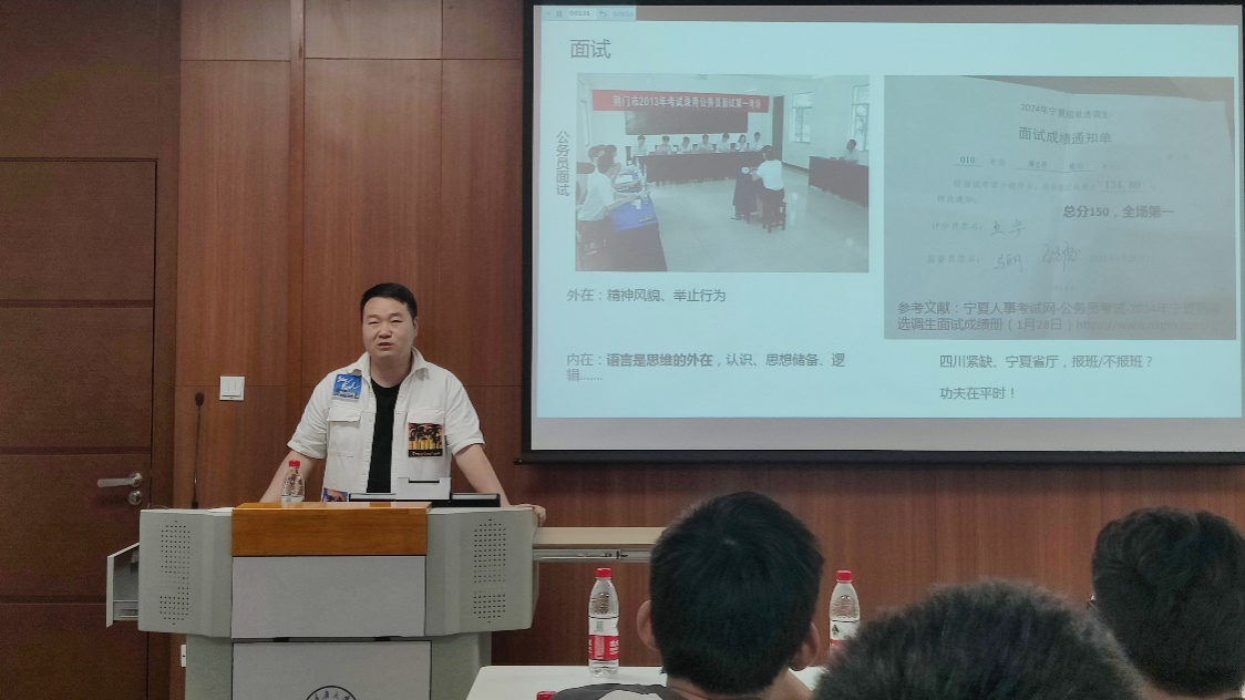 第二位分享者是姚远,他讨论了体制内工作的特点,包括岗位的稳定性和竞争性,并分析了体制内的核心竞争资源。姚远建议同学们要重视书面表达能力的培养,要学会从海量信息中筛选出自己需要的内容。他提到,语言是思维的外在体现,要把语言表达当做一种能力来培养,而不是为了应试。他还分享了公务员面试的流程和技巧,鼓励同学们在面试中保持冷静,清晰地表达自己的观点。
