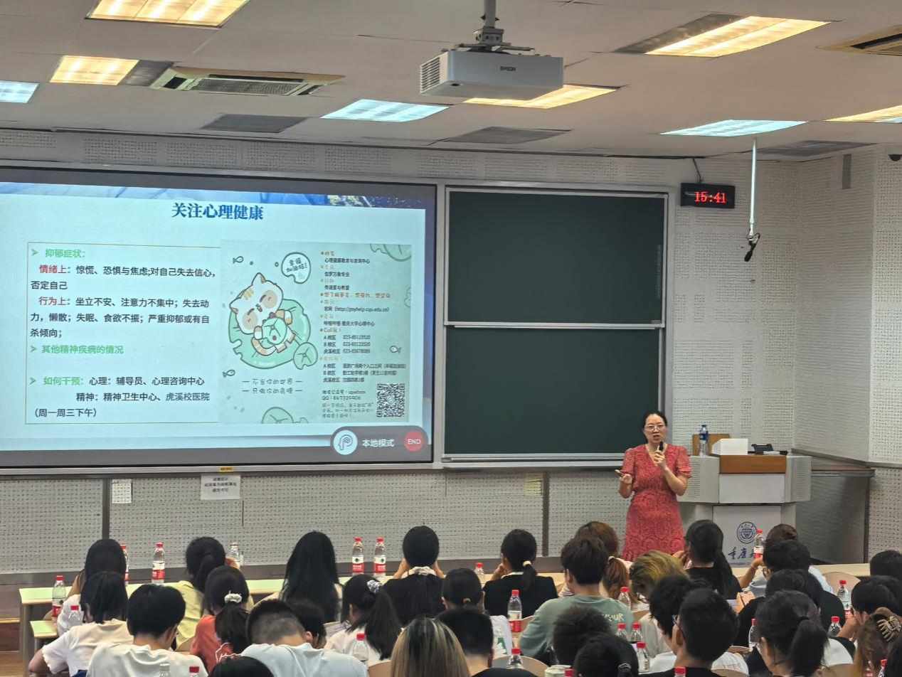 伍丽向同学们逐一介绍了各班的班主任和学业助理,以便于同学们的学习生活,助力成人成才。还详细地讲解了各项办事指南,提醒同学们关注工作群消息以及各大官网,强调了请假销假流程,为同学们的大学生活保驾护航。